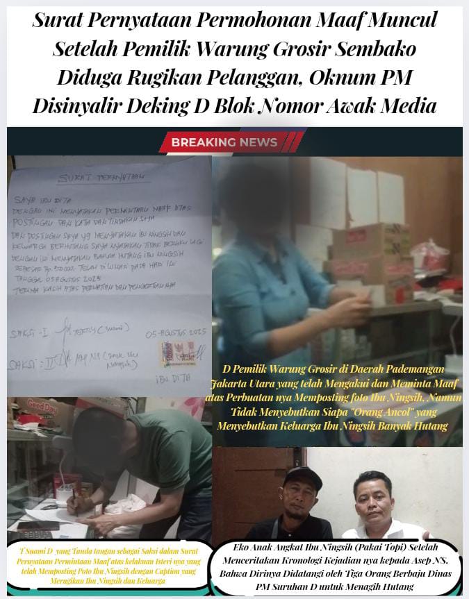 SidakCepatNews.com – Jakarta Utara, 7 Agustus 2025 – Sebuah surat pernyataan permohonan maaf muncul setelah seorang pemilik warung grosir sembako berinisial D diduga melakukan tindakan yang merugikan salah satu pelanggannya, Ibu Ningsih. Kejadian ini bermula ketika D membuat story WhatsApp yang memposting foto Ibu Ningsih bersama cucunya tanpa izin, disertai caption yang dianggap sangat merugikan korban dan keluarganya. Hal ini dipicu oleh keterlambatan pembayaran sisa belanja sebesar Rp 500.000. surat tersebut dibuat tanggal 5 Agustus 2025 di warung milik D dan T.