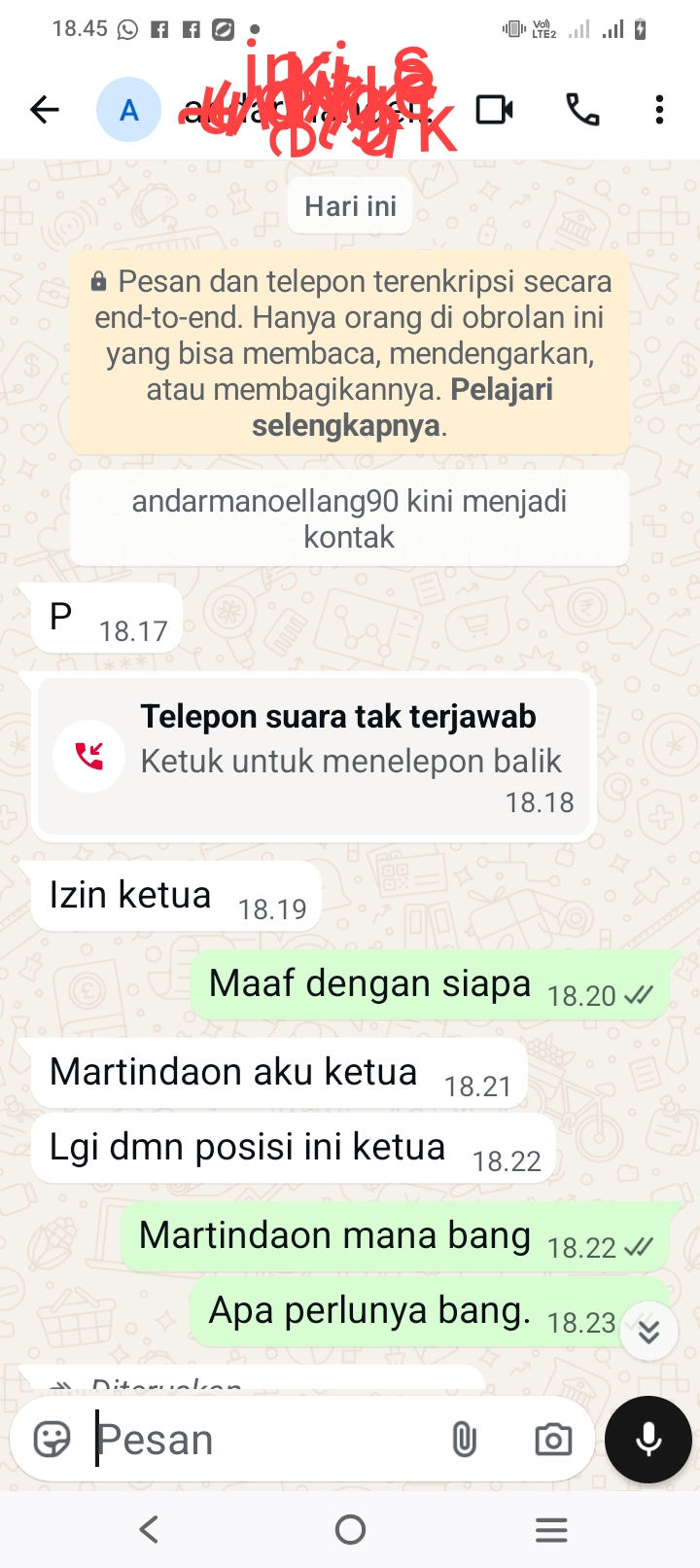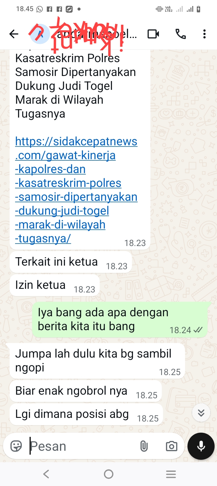 “Izin ketua Martindaon, aku ketua. Lagi di mana posisi ketua terkait berita ini?” bunyi pesan yang diterima wartawan, merujuk pada berita yang telah tayang.
